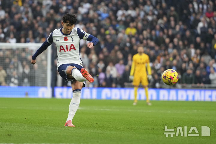 [런던=AP/뉴시스] Son Heung-min of Tottenham hotspur is shooting in teh 10th round of the 2024-25 season Premier League (EPL) 10th round at the Tottenham hotspur Stadium in London, England. Son Heung-min helped Brennan Johnson’s tie (3) in the second half of the fourth minute, and was replaced 11 minutes in the second half and the team won 4-1. 2024.11.04.