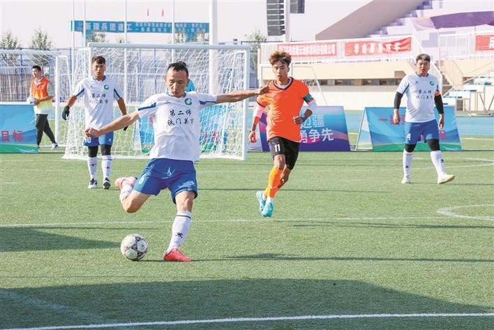 Xinjiang Hebingtuan National Football Super League scene, players fight hard on the green field (photographed on July 18). Photo by Li Huabei, resident reporter of Xingtuan Daily