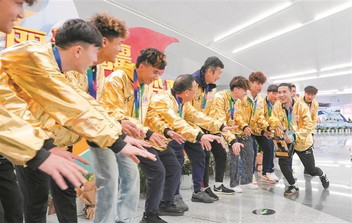 On December 25, the winning team from Shihezi Town of the Eighth Division of the Corps celebrated their victory at Tianshan International Airport after their triumphant return. Photo by Chen Yang, all-media reporter of Xingtuan Daily