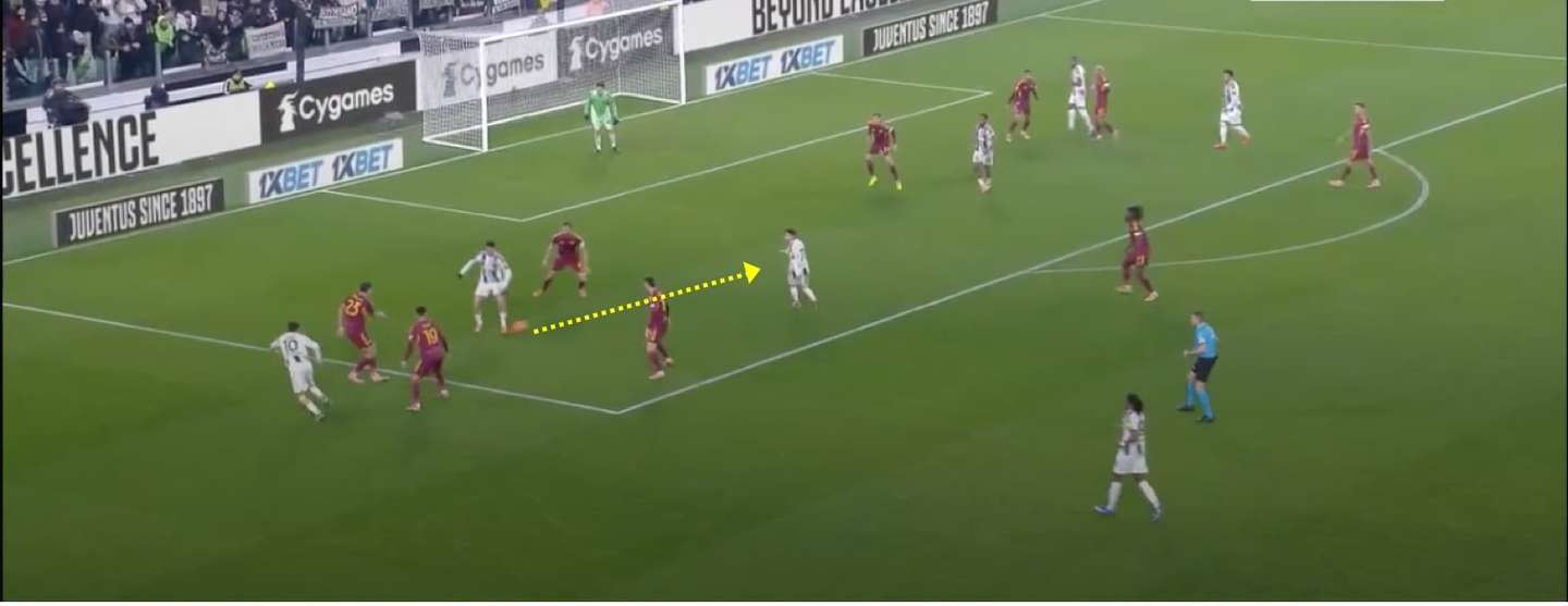 With Roma low Locatelli supported Cambiaso on the center left. Yildiz opened up, dragging Mancini and Openda, with his usual inside-outside cut, called the ball into the space freed up by the Italian centre-back. The Belgian held up Ziolkowski and supported Yildiz who, thanks to a feint and Cambiaso’s vertical movement, attracted two men, his marker Celik and Baldanzi, thus giving Thuram more time to receive his pass and raise his head.