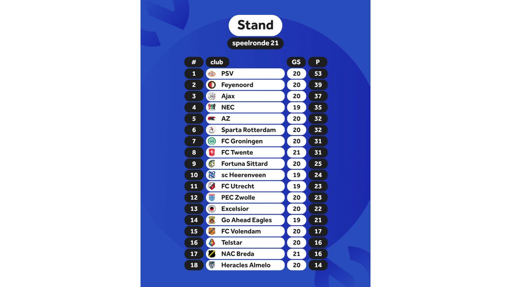 Due to the eighth draw in eleven unbeaten Premier League matches and the tenth this season, FC Twente remains in eighth place in the Premier League. NAC remains seventeenth.